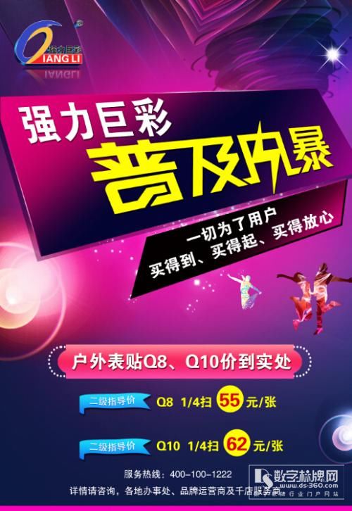 強(qiáng)力巨彩為普及全彩而來,普及風(fēng)暴再度升級,戶外表貼Q8(1/4掃)二級指導(dǎo)價(jià)僅為55元/張,Q10(1/4掃)二級指導(dǎo)價(jià)僅為62元/張。