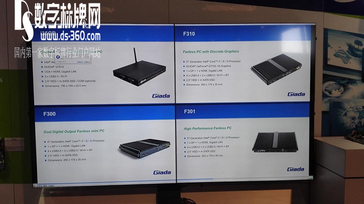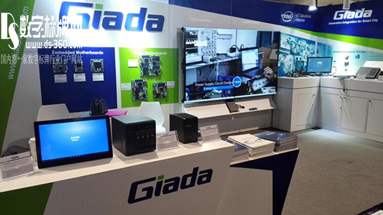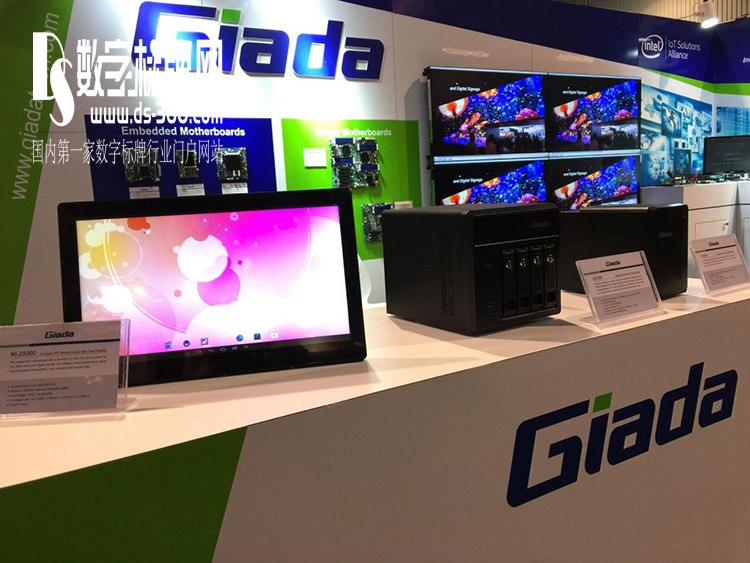 杰和科技整個展臺以品牌Giada 藍綠為主,簡單明快。服務器主板、桌面虛擬化和數(shù)字標牌智能終端一覽無遺。