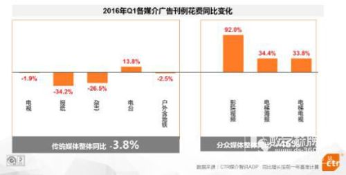 2016年一季度,傳統(tǒng)媒體收入繼續(xù)下降,降幅為-3.8%,保持增長(zhǎng)的依舊是分眾電梯電視33.8%、電梯海報(bào)34.4%和影院視頻92%,互聯(lián)網(wǎng)廣告則保持28.4%的平均增幅。