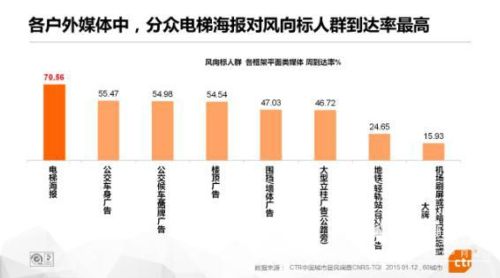 分眾電梯媒體覆蓋120個(gè)城市,110萬(wàn)塊電梯海報(bào),18萬(wàn)塊電梯電視,每天覆蓋的這2億消費(fèi)者是20-45歲,中高收入的城市主流消費(fèi)群,這些白領(lǐng),金領(lǐng),商務(wù)人群,中產(chǎn)階級(jí)是引領(lǐng)消費(fèi)升級(jí)的核心人群。所以在到達(dá)這些具有風(fēng)向標(biāo)價(jià)值的主流消費(fèi)人群方面占有非常突出的優(yōu)勢(shì)。在視頻類媒體中,對(duì)風(fēng)向標(biāo)人群,分眾電梯電視的周到達(dá)率是52.6%,高于各大電視臺(tái)和各大視頻網(wǎng)站。而電梯海報(bào)周到達(dá)率70.56%,也高于其他平面類戶外媒體。