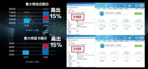 3160的魯大師綜合得分比3150領(lǐng)先約15%,顯卡跑分比3150高15%