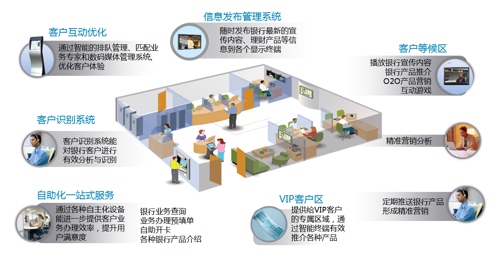 TCL商用根據(jù)中國建設(shè)銀行的五星級需求科學設(shè)置了智能服務(wù)、VIP休息、自助填單、網(wǎng)銀互動、特色櫥窗等功能區(qū)域,通過鋪設(shè)不同的商用顯示屏幕,組成一個智慧營銷網(wǎng)絡(luò)。建設(shè)的內(nèi)容包括: