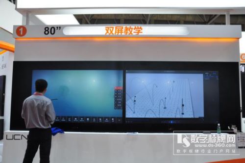 走進泛普的展位,溫暖鮮明的橙色logo映入眼簾及精心布局的主講區(qū),主講區(qū)正對觀眾的位置,掛著今天的主角之一——86英寸4K超高清納米觸控黑板。