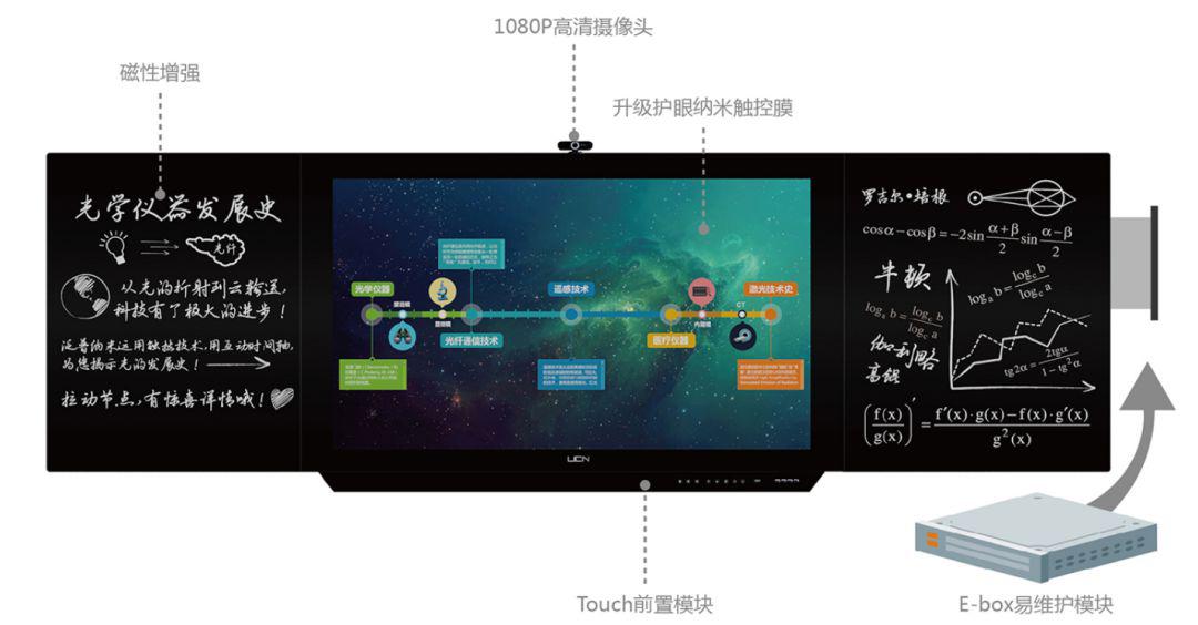 在傳統(tǒng)納米黑板上,泛普采用自主創(chuàng)新的E-Box嵌入于黑板右側(cè),將OPS等多樣核心設(shè)備集成于小巧精致的E-Box內(nèi),在設(shè)備的維護(hù)上,只要屏體不被破壞,則只需要輕松拉出更換備份Box即可,而不需要如傳統(tǒng)電視機(jī)、紅外一體機(jī)一般對(duì)整體機(jī)器進(jìn)行拆除維護(hù)。對(duì)于校園學(xué)習(xí)效率提升進(jìn)行了極大改善,只需30分鐘,即可恢復(fù)正常使用。