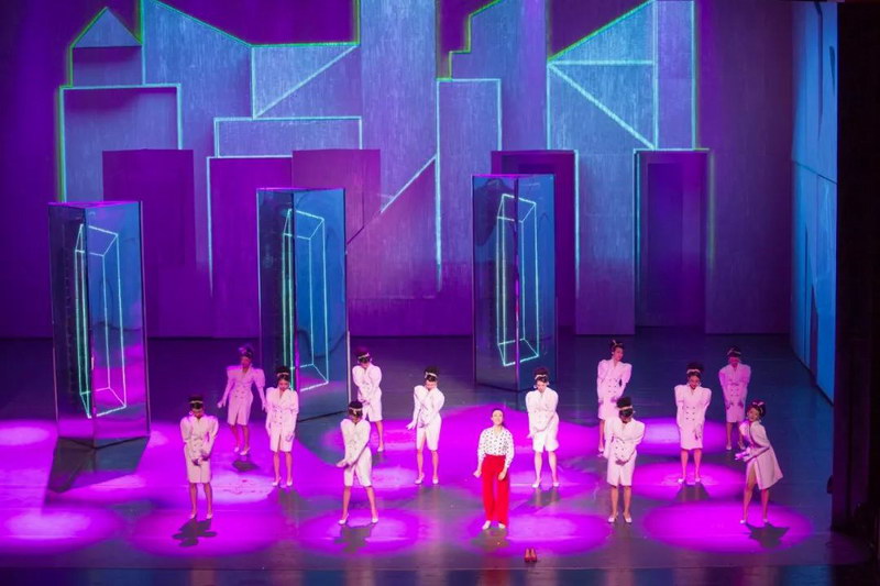 在第二幕中,巨型三棱柱先是靜置在舞臺(tái)上,與背景墻融為一體,伴隨著舞劇演出進(jìn)度,巨型三棱柱被演員推移到舞臺(tái)中央,通過Wi-Fi傳輸方式,三棱柱上的巨幅柔性顯示屏不時(shí)切換高清、艷麗的圖片,與舞臺(tái)背景交相輝映,共同打造出光怪陸離的都市霓虹景象,帶來沖擊力極強(qiáng)的裸眼3D視覺效果。