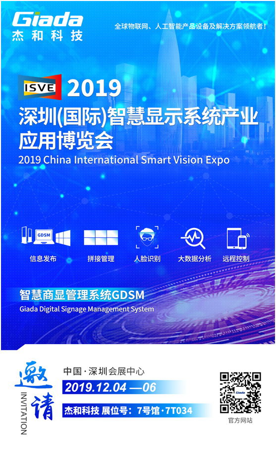 【前言】杰和科技將攜自研的GDSM AI人臉識別解決方案及多款智能硬件及主板(包括多屏拼接播放器、X86系列播放器、ARM系列播放器、AI播放器以及主板產(chǎn)品)亮相2019 深圳(國際)智慧顯示系統(tǒng)產(chǎn)業(yè)應(yīng)用博覽會 。杰和科技在7號館7T034號展位恭候各位朋友蒞臨參觀。