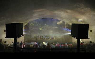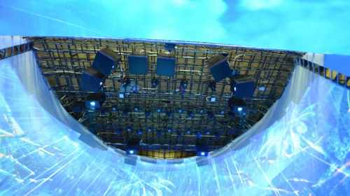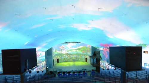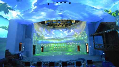 超感5D沉浸式海島臺風體驗館作為海南檳榔谷黎苗文化旅游區(qū)重要景點之一,共采用14臺NEC PA803UL+投影機(采用恒溫箱隱藏式安裝)以3D-Mapping技術(shù)、270°穹頂和全息空間成像打造。