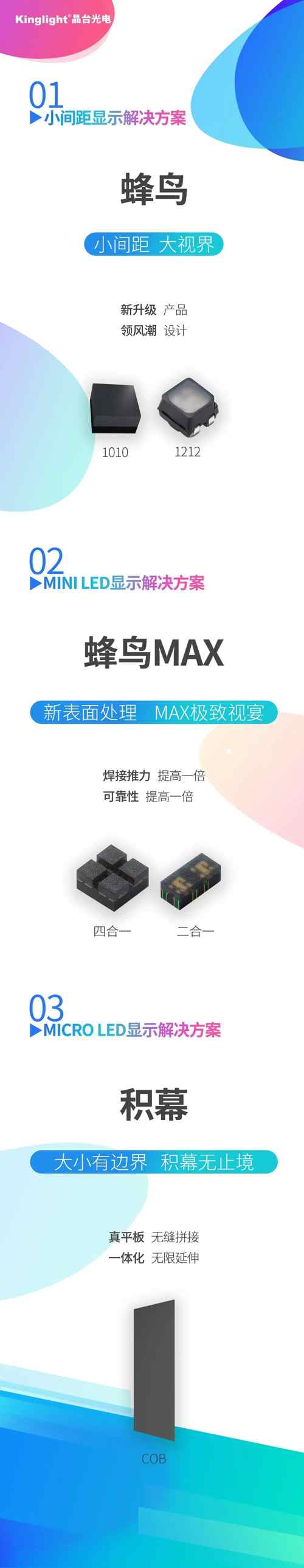 為滿足用戶細分場景的應用需求,晶臺全新打造了小間距、Mini LED、Micro LED全系列解決方案,成為業(yè)內首家可同時提供3款前沿應用的企業(yè),包括以下產(chǎn)品: