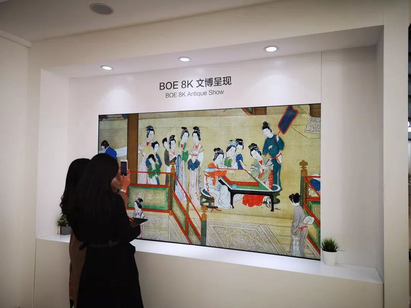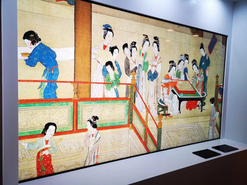 在110英寸8K超高清顯示屏上,細(xì)膩逼真的呈現(xiàn)著明代繪畫大師仇英的歷史名作,通過文博互動(dòng)系統(tǒng),參觀者可以在移動(dòng)終端上放大每個(gè)畫面細(xì)節(jié),無論是植物枝葉的紋理,還是畫作人物的一顰一笑,都栩栩如生地展現(xiàn)在眼前,極具視覺震撼力。