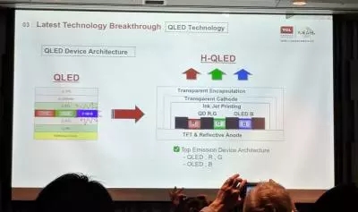 TCL日前宣布,正在開發(fā)一種新型混合顯示技術(shù),該技術(shù)采用藍(lán)色OLED發(fā)光體以及紅色和綠色QD發(fā)光體。所有三種發(fā)光材料將采用噴墨印刷技術(shù)進行組合和印刷。TCL稱這種技術(shù)為H-QLED,這可能是TCL未來高端電視顯示的首選技術(shù)。