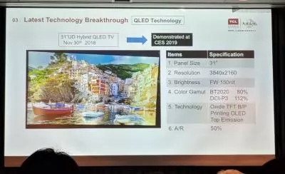 TCL長期以來一直關(guān)注用于OLED電視生產(chǎn)的噴墨印刷技術(shù),公司已經(jīng)推出了幾款QD-LED顯示器和噴墨印刷OLED顯示器的原型。在CES 2019展會上,TCL展示了基于氧化物TFT背板的4K(3840x2160)31英寸H-QLED顯示器。
