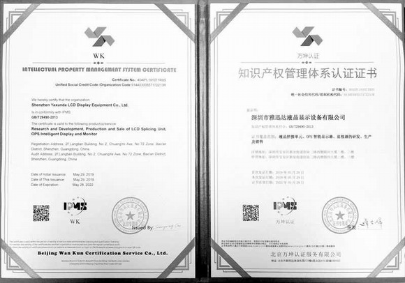 深圳市雅迅達(dá)液晶顯示設(shè)備有限公司依照國(guó)家標(biāo)準(zhǔn)《GB/T29490-2013 企業(yè)知識(shí)產(chǎn)權(quán)管理規(guī)范》,建立了“知識(shí)產(chǎn)權(quán)管理體系”,該體系于今年5月29日順利通過(guò)北京萬(wàn)坤認(rèn)證服務(wù)有限公司的現(xiàn)場(chǎng)審核,并獲得證書(shū)。