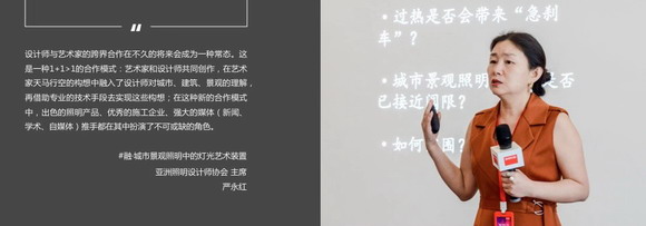 亞洲照明設(shè)計師協(xié)會主席、重慶大學(xué)建筑學(xué)院教授嚴(yán)永紅表示道:“藝術(shù)家和設(shè)計師共同創(chuàng)作,在藝術(shù)家天馬行空的構(gòu)想中融入了設(shè)計師對城市、建筑、景觀的理解,再借助專業(yè)的技術(shù)手段去實(shí)現(xiàn)這些構(gòu)想;在這種新的合作模式中,出色的照明產(chǎn)品、優(yōu)秀的施工企業(yè)、強(qiáng)大的媒體(新聞、學(xué)術(shù)、自媒體)推手都扮演了不可或缺的角色!彪S著光信息時代的到來,設(shè)計師與藝術(shù)家的跨界合作將會成為一種常態(tài),這是一種1+1>1的合作模式。