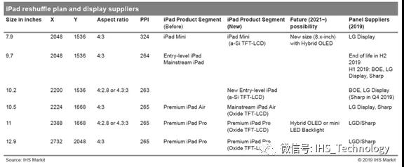 9.7英寸入門款iPad目前是iPad的大批量產(chǎn)品。顯示屏供應(yīng)商包括京東方、樂金顯示和夏普。9.7英寸款型預(yù)計(jì)將在2019年下半年停產(chǎn),并將被新的10.2英寸款型取代。