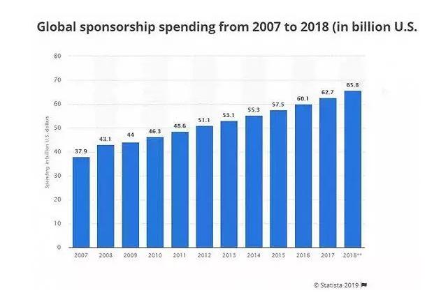 1937年的9月16日,英國廣播公司(BBC)通過電視直播了阿森納一線隊和預備隊的一場比賽,這次直播觸達了數(shù)以萬計的用戶,讓品牌廣告的投放找到了一個優(yōu)質(zhì)的場景。根據(jù)Statista的統(tǒng)計,目前每年全球的體育營銷投放市場已經(jīng)達到了660億美元。