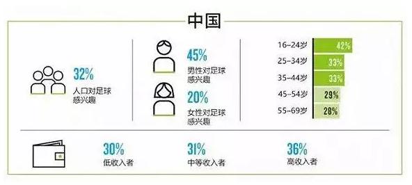 2018年ECO氪體與尼爾森體育共同發(fā)布的《世界足球報告中文版》顯示,中國32%的人口對于足球運動感興趣,而18%的人口對于英超聯(lián)賽表現(xiàn)出濃厚興趣!妒澜缱闱驁蟾嬷形陌妗凤@示,中國32%的人口對于足球運動感興趣。