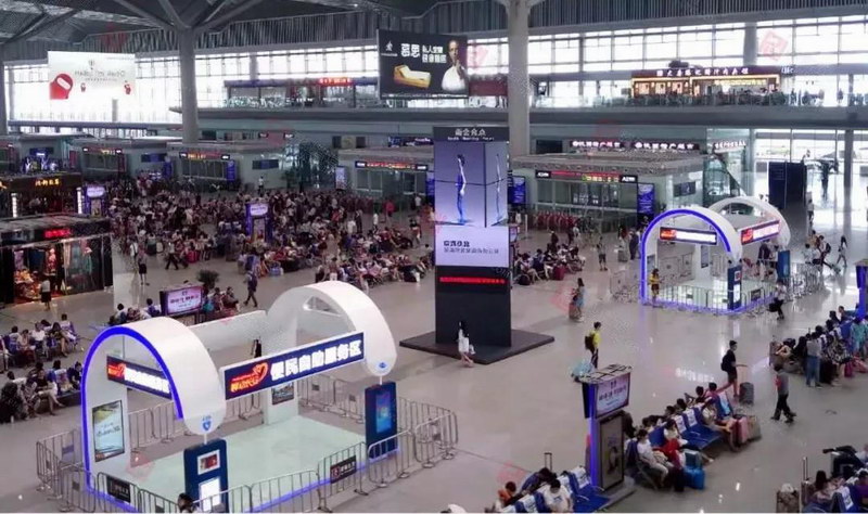 處于高鐵站這樣封閉的環(huán)境中,人群的目光很容易首先被面積巨大的電子屏吸引。面積大,是電子屏最出色的優(yōu)勢(shì),且遠(yuǎn)視效果極佳,舉目可見。