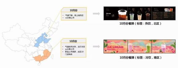 除基本的聯(lián)屏展示、定時(shí)播放等功能外,數(shù)拓OS可支持品牌總部針對(duì)區(qū)域時(shí)令水果、氣溫、營銷規(guī)劃的不同,進(jìn)行區(qū)域化管理。