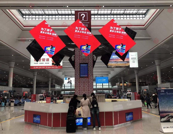 貴陽北站候車大廳引入磐景智造旋轉(zhuǎn)屏,成為綜合服務臺一抹亮麗的色彩。9屏配合,多方旋轉(zhuǎn),源源不斷輸出創(chuàng)意,讓廣告內(nèi)容展示更有趣、更吸睛。