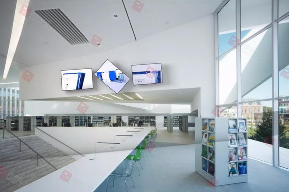 圖書館中引入磐景智造旋轉(zhuǎn)屏設備,用三塊旋轉(zhuǎn)屏組合的方式來傳遞館內(nèi)信息。設備轉(zhuǎn)動方式多樣,讓創(chuàng)意更加盡情展示。