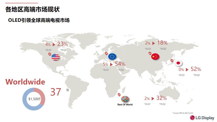 目前,OLED正在引領高端電視市場的發(fā)展。OLED電視在中國地區(qū)的滲透率較低,但隨著消費者對于OLED的認知度和認可度的逐步提升,這種情況有望在2019年得到改善。