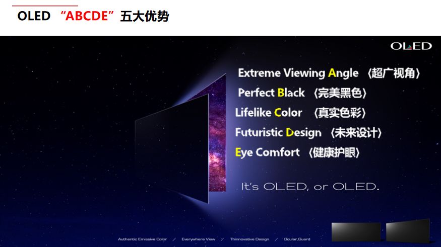 LG巧妙地用“ABCDE”五個字母總結了OLED的優(yōu)勢。安乘模介紹說,其中A是Wide Viewing Angles超廣視角,B是True Blacks完美黑色,C是Vibrant Color鮮明的色彩,D是Super Thin Design超薄設計,E是Eye Comfort健康護眼。