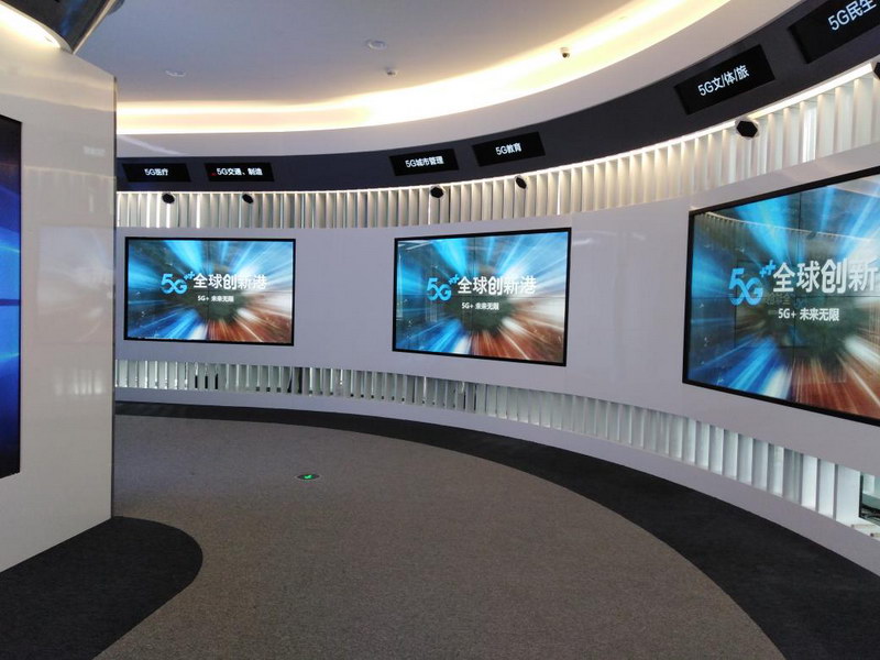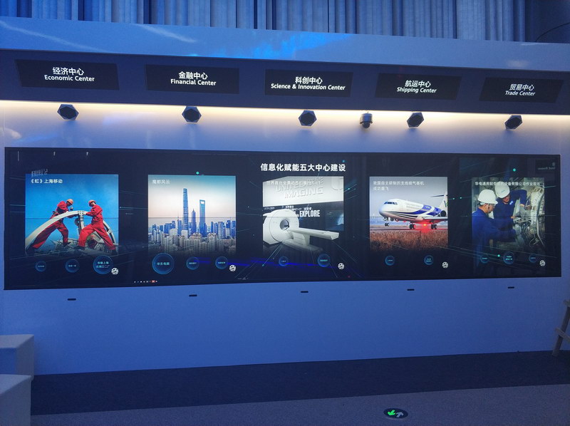 在開港儀式上,上海市委常委、副市長吳清出席并啟動了“5G全球創(chuàng)新港”,市政府副秘書長陳鳴波和虹口區(qū)委書記吳信寶共同為虹口“上海5G綜合應(yīng)用先導(dǎo)示范區(qū)”揭牌。隨后他們在工作人員的引導(dǎo)下觀摩體驗(yàn)創(chuàng)新港區(qū)。港區(qū)共四層,一層為上海5G綜合應(yīng)用展示廳,共分為九大展示區(qū),重點(diǎn)展示5G網(wǎng)絡(luò)、技術(shù)、應(yīng)用和產(chǎn)業(yè)創(chuàng)新生態(tài),在這一層,吳清副市長一行駐足在產(chǎn)業(yè)創(chuàng)新生態(tài)廳,仔細(xì)觀摩體驗(yàn)。展示經(jīng)濟(jì)、金融、科創(chuàng)、航運(yùn)、貿(mào)易的互動大屏;哟笃潦遣捎眯袠I(yè)尖端的0.88拼縫的超窄拼接液晶屏,由55寸2行5列橫拼拼接,并加載真16點(diǎn)紅外觸摸屏。