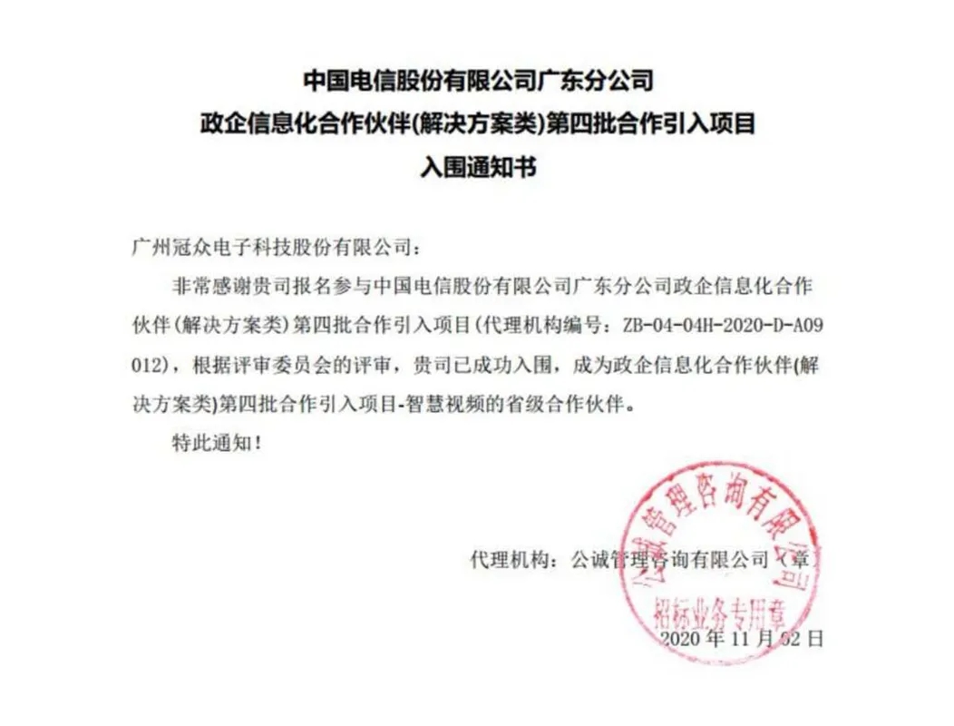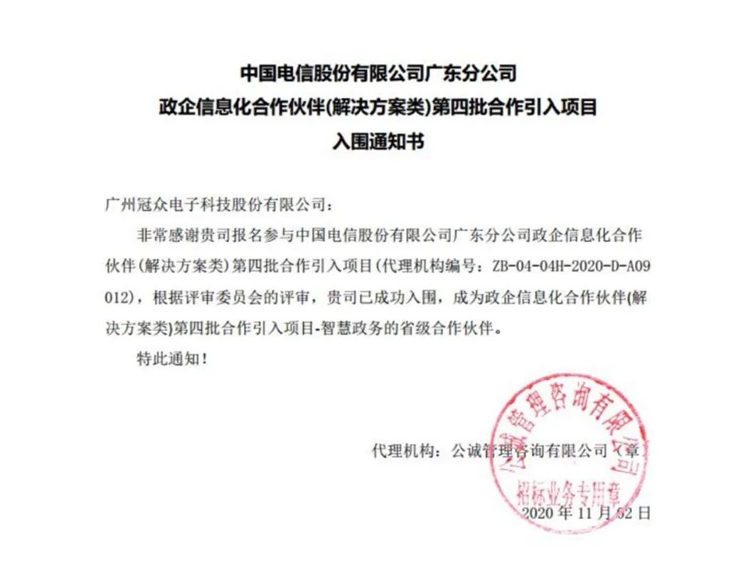 本次入圍是中國電信對冠眾科技綜合實(shí)力與技術(shù)水平的高度肯定。未來,冠眾科技將以此為動力,持續(xù)不斷創(chuàng)新,提供更優(yōu)質(zhì)的行業(yè)解決方案與服務(wù)!