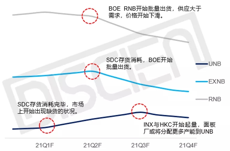 DISCIEN預(yù)測明年UNB將會有兩個(gè)價(jià)格拐點(diǎn),第一個(gè)拐點(diǎn)在Q1末,SDC囤貨消耗殆盡及Q2需求增加導(dǎo)致供不應(yīng)求,價(jià)格將會上漲;第二個(gè)拐點(diǎn)會在Q3末,INX及HKC UNB產(chǎn)品開始起量、面板廠或?qū)⒎峙涓喈a(chǎn)能到UNB的雙重驅(qū)動(dòng)下將會緩解市場上缺貨的狀況,價(jià)格趨于平穩(wěn)或小幅下滑;