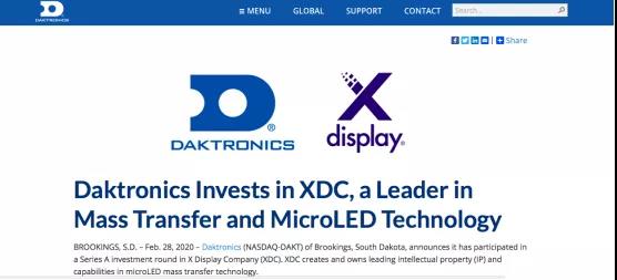 2月28日消息,美國LED顯示屏大廠Daktronics (達科電子)宣布已參與X Display Company (XDC)的A輪投資。XDC是由巨量轉(zhuǎn)移技術(shù)領(lǐng)先廠商X-Celeprint分拆出來的公司,擁有Micro LED巨量轉(zhuǎn)移技術(shù)的領(lǐng)先知識產(chǎn)權(quán)(IP)與制造能力。