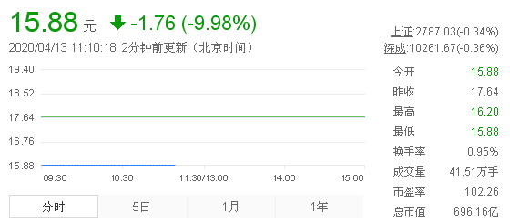 4月13日消息,藍(lán)思科技(15.880, -1.76, -9.98%)早盤因定增價(jià)過低而跌停開盤。