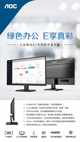在以低能耗、低污染、低排放為基礎(chǔ)的“低碳經(jīng)濟(jì)”時(shí)代背景下,各大行業(yè)領(lǐng)域企業(yè)都在尋求節(jié)能、環(huán)保、高效的運(yùn)行管理模式。如何保障正常生產(chǎn),實(shí)現(xiàn)可持續(xù)發(fā)展,提高市場(chǎng)競(jìng)爭(zhēng)力成企業(yè)關(guān)注重點(diǎn)。基于綠色辦公的時(shí)代背景及企業(yè)訴求,AOC推出E2系列商用顯示器為企業(yè)帶來(lái)有效助益!