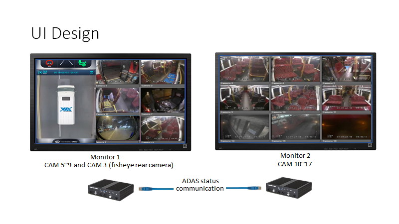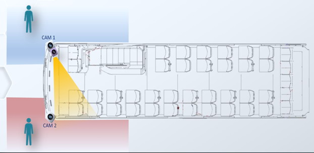 雙層巴士具有空間、車身高且長等特點,對其車外實施前后方防碰撞預(yù)警、車道偏移警示,以及車身360度環(huán)視、移動物體檢測(MOD)時,需要調(diào)整模型算法。對雙層巴士的內(nèi)部監(jiān)控,由于空間大,需要充分考慮監(jiān)控點多,各個檢測點的同步,回傳及時性、展示界面的設(shè)計都是需要考慮的。