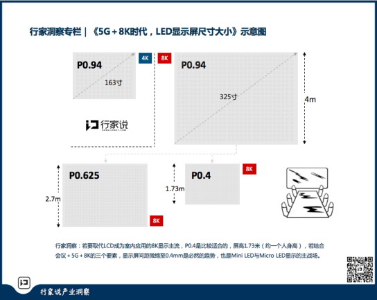 行家洞察:若要取代LCD成為室內(nèi)應(yīng)用的8K顯示主流,P0.4是比較適合的,屏高1.73米(約一個(gè)人身高),若結(jié)合會(huì)議+5G+8K的三個(gè)要素,顯示屏間距微縮至0.4mm是必然的趨勢,也是Mini LED與Micro LED顯示的主戰(zhàn)場。