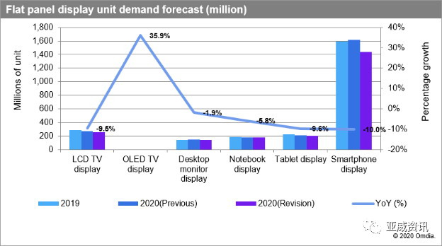 Omdia大幅削減了對2020年液晶電視和智能手機顯示器需求的預(yù)測。液晶電視的顯示器出貨量預(yù)計將下降9.5%,而智能手機將下降10%。