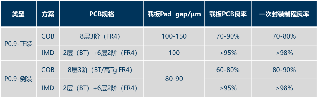 目前P0.9正裝和倒裝IMD方案,載板PCB良率可做到>95%,一次封裝制程良率更高,均>98%