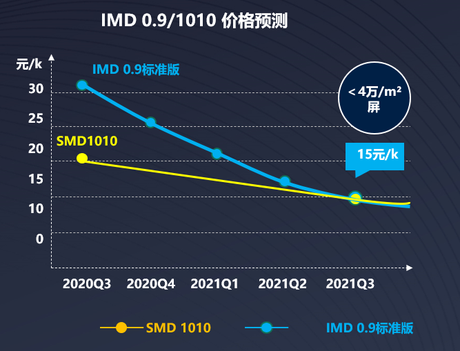 國星光電RGB超級事業(yè)部已于11月底正式宣布全新IMD 0.9標準版+旗艦版同步上市。此外,RGB超級事業(yè)部計劃于2021年Q1將目前IMD產(chǎn)能的1000KK/月提高至 2000KK/月。隨著良率與效率的提升,加上產(chǎn)能的提高,標準版預計未來能做到0.015元/像素點,而對應到整屏的成本,將低于4萬元/㎡。
