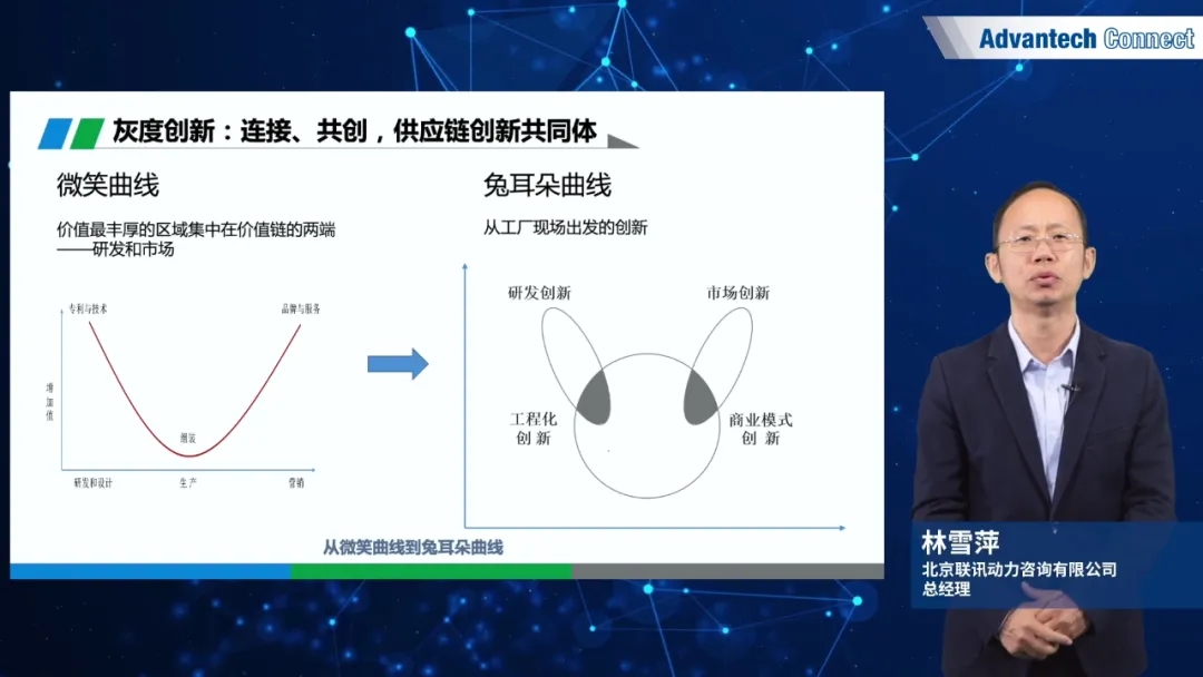 所以,無論是跟上游設(shè)計研發(fā)的結(jié)合,還是跟下游用戶的結(jié)合,我們都注意到整個制造其實從一個單薄的微笑曲線,走向一個兔耳朵曲線的混合區(qū)域。這就是我這本書取名《灰度創(chuàng)新》的原因,探討制造商和上游、下游之間的結(jié)合,如何通過外部知識交換,形成新型伙伴主義,共同創(chuàng)新。