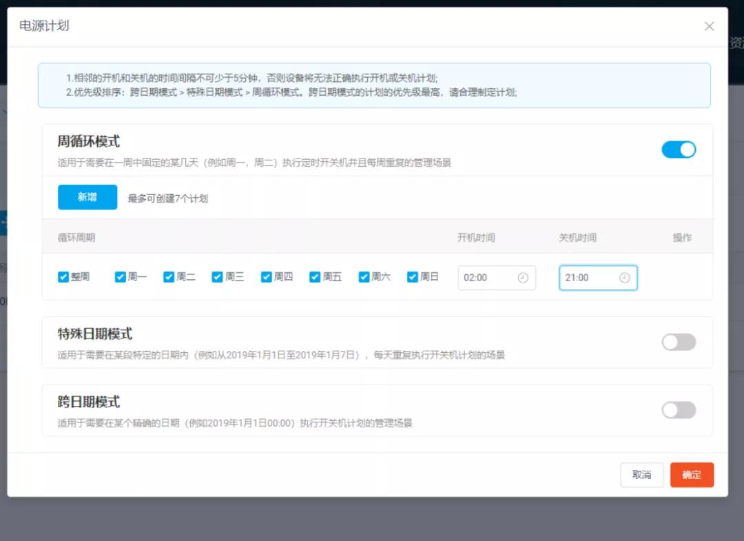 支持遠(yuǎn)程執(zhí)行電源計劃,用戶可以按照周循環(huán)模式、特殊日期模式、跨日期模式設(shè)置開關(guān)機(jī)時間。