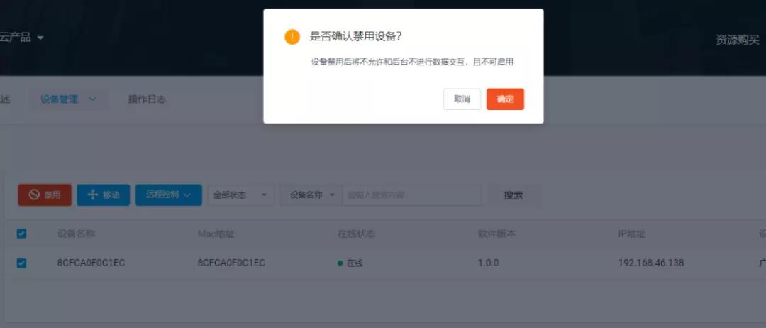 支持遠(yuǎn)程禁用設(shè)備,用戶在設(shè)備列表中勾選 1 個或者多個需要禁用的設(shè)備,點(diǎn)擊列表上方的“禁用”按鈕,二次確認(rèn)后可禁用設(shè)備,禁用設(shè)備成功,設(shè)備關(guān)機(jī)。