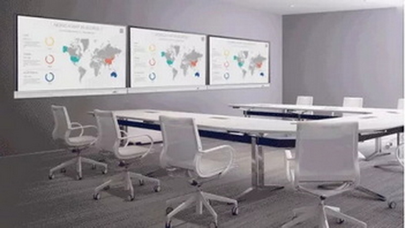 可根據(jù)場(chǎng)地大小,選擇65、75、86寸會(huì)議白板做三聯(lián)屏部署。