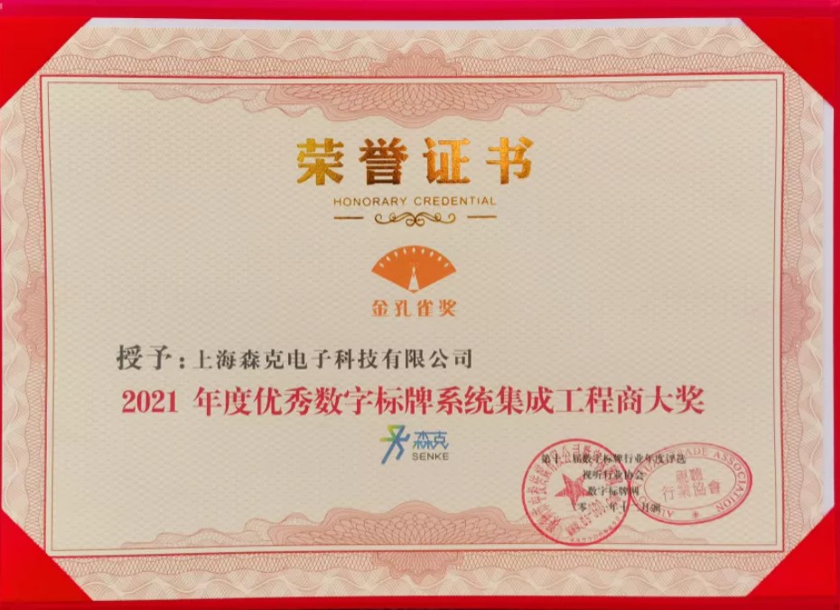 老牌數(shù)字標(biāo)牌、商顯設(shè)備制造商森克,憑借優(yōu)質(zhì)的產(chǎn)品、創(chuàng)新的服務(wù)以及客戶(hù)、評(píng)委的一致推薦,此次評(píng)選中榮獲“2021年優(yōu)秀數(shù)字標(biāo)牌系統(tǒng)集成工程商大獎(jiǎng)”和“2021年優(yōu)秀商顯設(shè)備整體解決方案供應(yīng)商大獎(jiǎng)”兩項(xiàng)殊榮。
