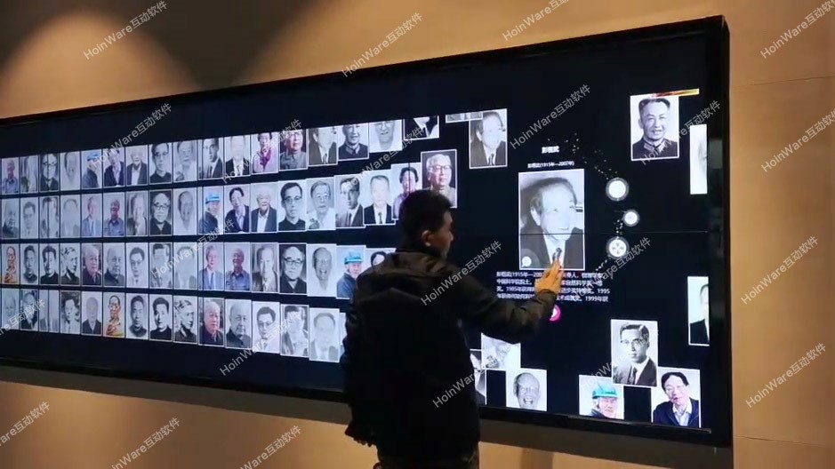 HoinWare為威海榮成博物館打造的“兩彈一星功勛墻軟件”,用滿屏的功勛人物照片進行有機排列,烘托莊重氛圍,再現(xiàn)“兩彈一星功勛”們的偉大歷史時刻。游客點開每位功勛人物照片,可以查看人物簡介,可任意拖動位置進行瀏覽,支持點贊和展開詳細介紹,也可以通過手機掃碼下載人物詳細介紹。