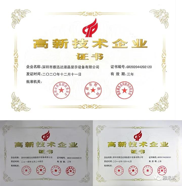 近日,深圳市雅迅達(dá)液晶顯示設(shè)備有限公司(雅迅達(dá))再次成功獲批"國(guó)家高新技術(shù)企業(yè)”認(rèn)證,并授予“高新技術(shù)企業(yè)證書(shū)”,證書(shū)編號(hào):GR202044202120,有效期三年。至此,雅迅達(dá)已經(jīng)連續(xù)9年獲批“國(guó)家高新技術(shù)企業(yè)”。