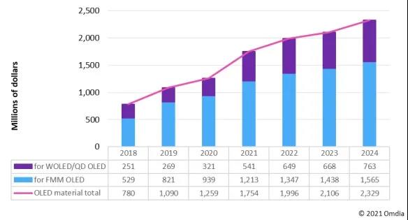 2021年全球OLED材料市場預(yù)計將增長40%,其中WOLED和QD OLED的材料營收預(yù)計增長69%,它將推動整個材料市場的增長。