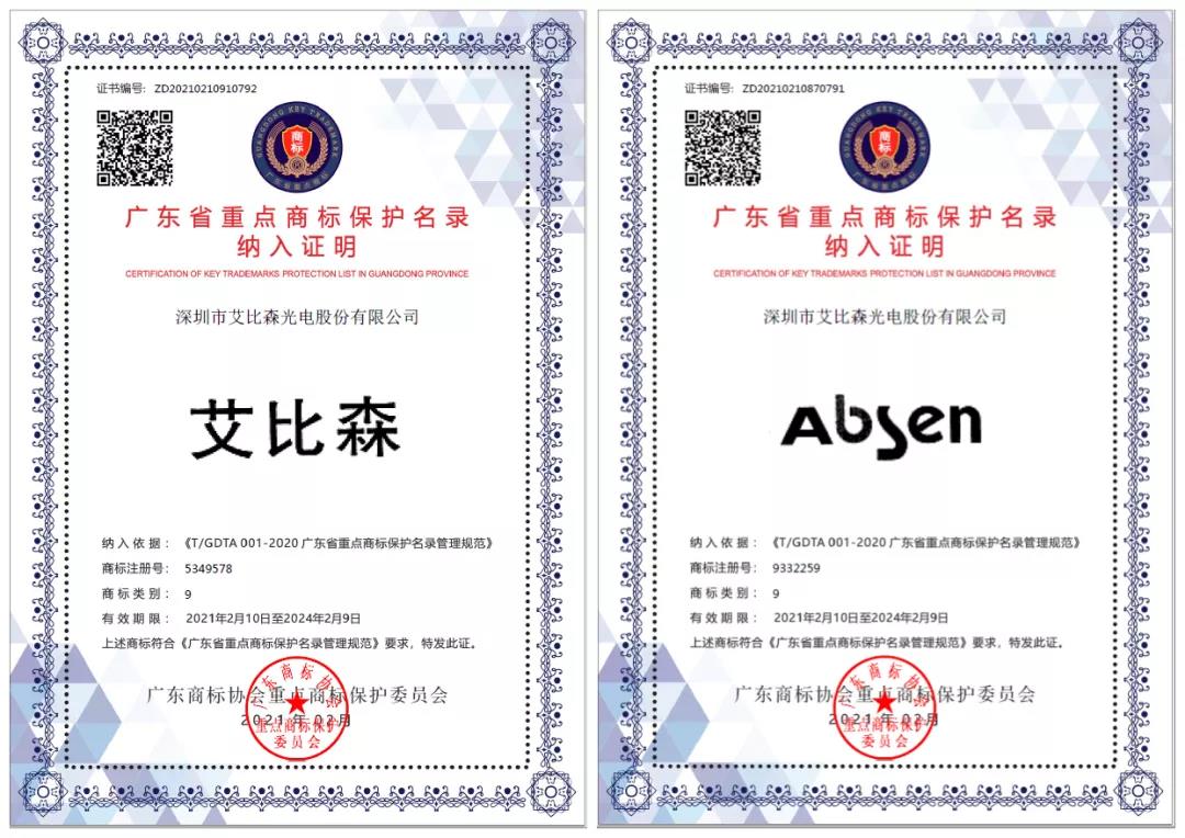 日前,廣東商標(biāo)協(xié)會(huì)公布了廣東省重點(diǎn)商標(biāo)保護(hù)名錄,深圳市艾比森光電股份有限公司的“艾比森”、“Absen”商標(biāo)榜上有名。
