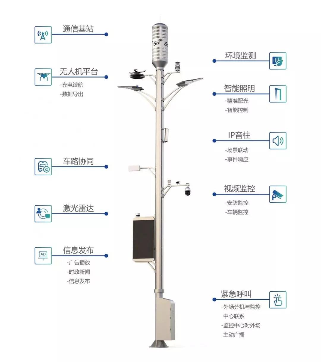 智慧燈桿集成了無線通訊、物聯網、云數據等先進技術,由軟件系統(tǒng)和硬件設備組成,通過掛載通信基站可加快5G智能網聯的全域開放;安裝激光雷達、攝像頭方便交管部門實時管理人流、車流;安裝環(huán)境檢測傳感器可實時采集溫濕度等環(huán)境數據,并反饋到LED顯示屏上;同時LED顯示屏搭配聯網功能模塊還可遠程控制信息播放;緊急呼叫模塊還為市民提供了安全求助功能···等等。