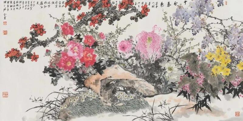 △ 上圖 羊城老九「十分春色」;下圖 《在地新生》展項(xiàng)「奇遇」-傳統(tǒng)嶺南花鳥(niǎo)與廣州天際線的結(jié)合