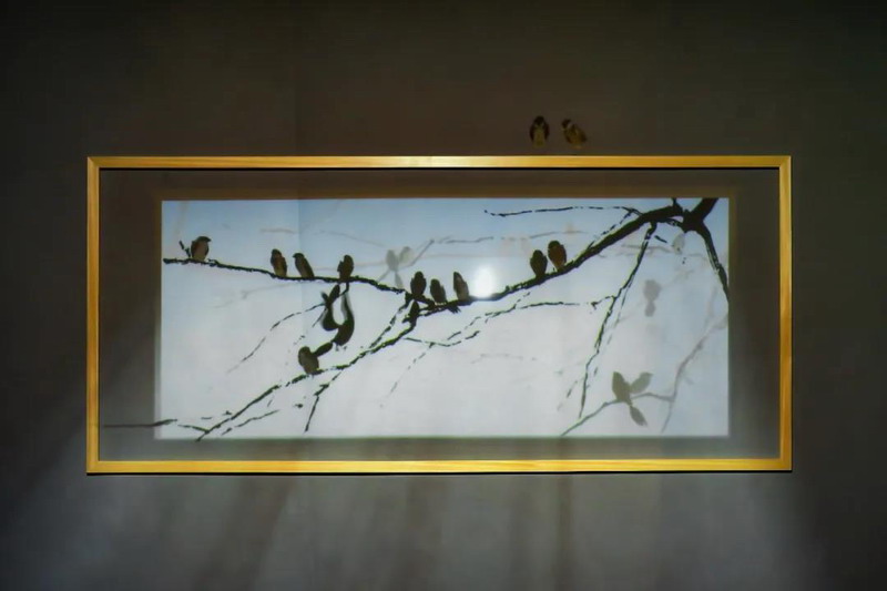 楊善深筆下的麻雀姿態(tài)自然、靈動(dòng),具有十足親和力。數(shù)字科技把靜態(tài)畫(huà)作傳達(dá)的「生命力」以動(dòng)態(tài)的形式呈現(xiàn)給大眾。當(dāng)人靠近影像,楊善深筆下的「麻雀」便像受到了驚嚇向四周飛散。