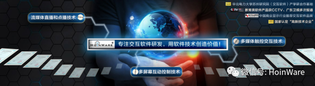 HoinWare品牌創(chuàng)立于2015年,隸屬于蘇州互云信息科技有限公司(國(guó)家認(rèn)定的高新技術(shù)企業(yè)、中國(guó)商顯行業(yè)推薦軟件品牌、世界500強(qiáng)企業(yè)軟件服務(wù)商),公司專注于多媒體、流媒體領(lǐng)域軟件技術(shù)研發(fā),擁有3大核心軟件技術(shù):多媒體觸控交互技術(shù)、多屏幕互動(dòng)及控制技術(shù)、流媒體直播和點(diǎn)播技術(shù),為多點(diǎn)觸摸屏、顯示屏、電腦主機(jī)等硬件設(shè)備賦予了新的互動(dòng)價(jià)值,產(chǎn)品廣泛應(yīng)用于教育、企業(yè)、展覽展示、新零售、金融、商業(yè)觸控顯示等多個(gè)領(lǐng)域!